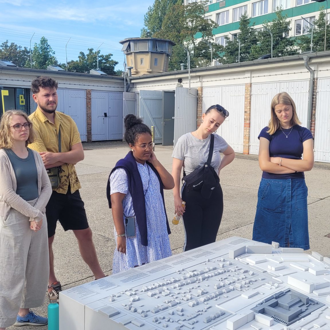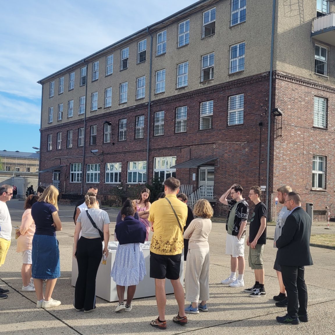 Das Programm startete mit einem Blick in die Vergangenheit: Beim Besuch der Gedenkstätte Berlin-Hohenschönhausen setzte sich die Düsseldorfer Gruppe intensiv mit verschiedenen Phasen politischer Verfolgung, Repression und Haft in der Zeit nach 1945 auseinander. Unter sowjetischer Besatzung und während der DDR befanden sich in auf dem heutigen Gedenkstättenareal Lager und Gefängnisse, in denen politische Gegner*innen gefangen gehalten und physischer und psychologischer Gewalt ausgesetzt wurden. Die DDR betrieb seit 1951 hier das zentrale Untersuchungsgefängnis der Staatssicherheit. Der geführte Rundgang durch die weitestgehend erhaltenen Gefängnisgebäude führte die Arbeit der Stasi und ihrer Funktion im DDR-System eindrucksvoll vor Augen.