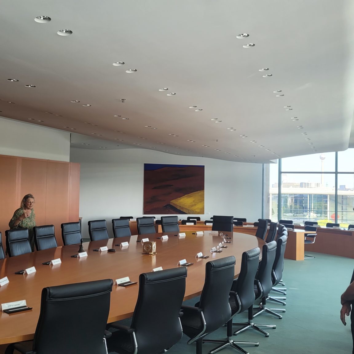 Nach einer Stadtrundfahrt wartete mit dem Besuch des Bundeskanzleramtes ein außergewöhnlicher Programmpunkt auf die Teilnehmenden. Besonders spannend: Der Blick in den Kabinettssaal, in dem sich jeden Mittwoch die Bundesregierung zu Beratungen trifft.
