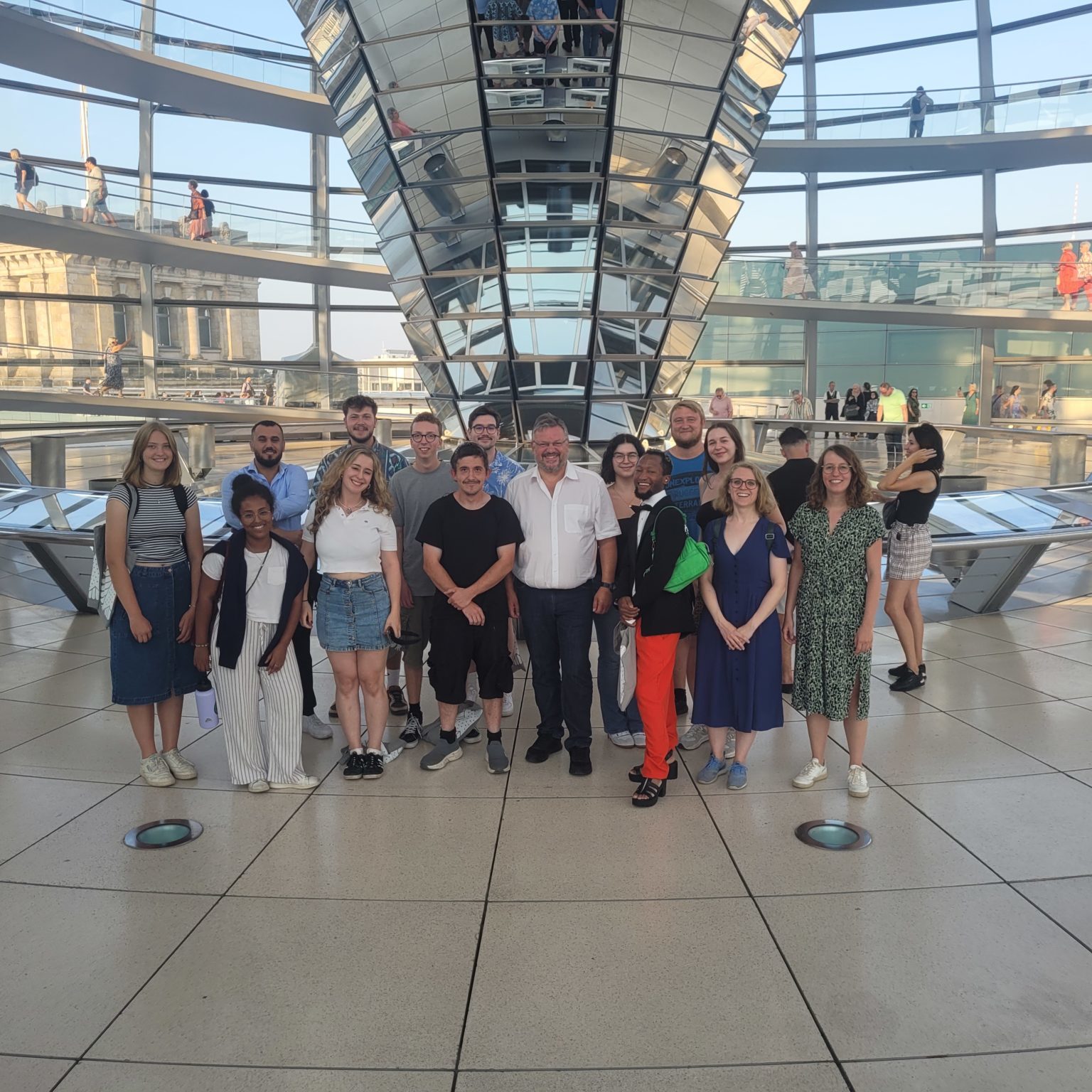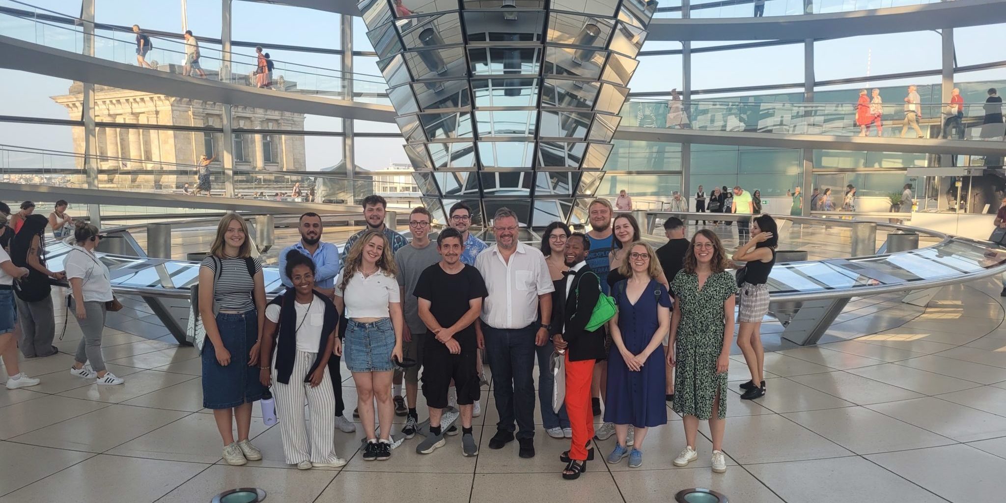 Nach einem Mittagessen auf dem Berliner Fernsehturm mit atemberaubender Aussicht ging es für die Düsseldorfer*innen ins Herz der deutschen Demokratie: Im Reichstagsgebäude besichtigten sie den Plenarsaal des Bundestags und informierten sich über die Arbeit des Parlaments. Selbstverständlich nahm sich auch der Gastgeber Zeit für die Besucher*innen: Andreas Rimkus gab interessante Einblicke in den Alltag eines Bundestagsabgeordneten. Den gemeinsamen Besuch der Kuppel des Reichstagsgebäudes nutzten die jungen Düsseldorfer*innen auch für intensiven Austausch zu aktuellen politischen Themen mit dem Abgeordneten.