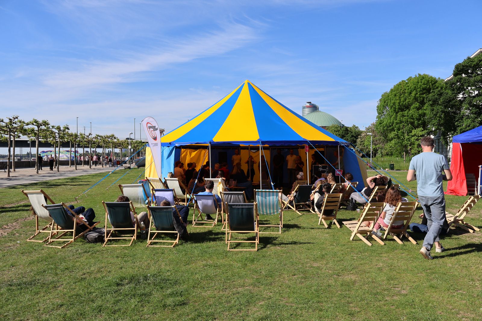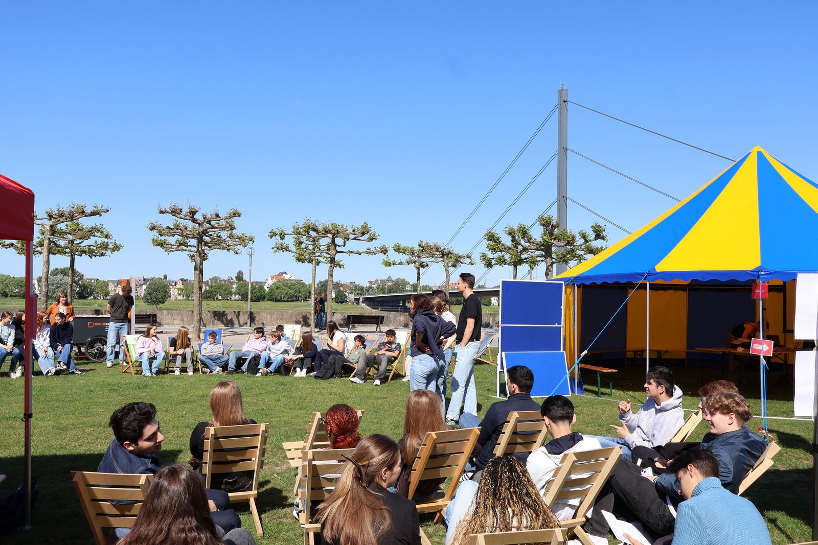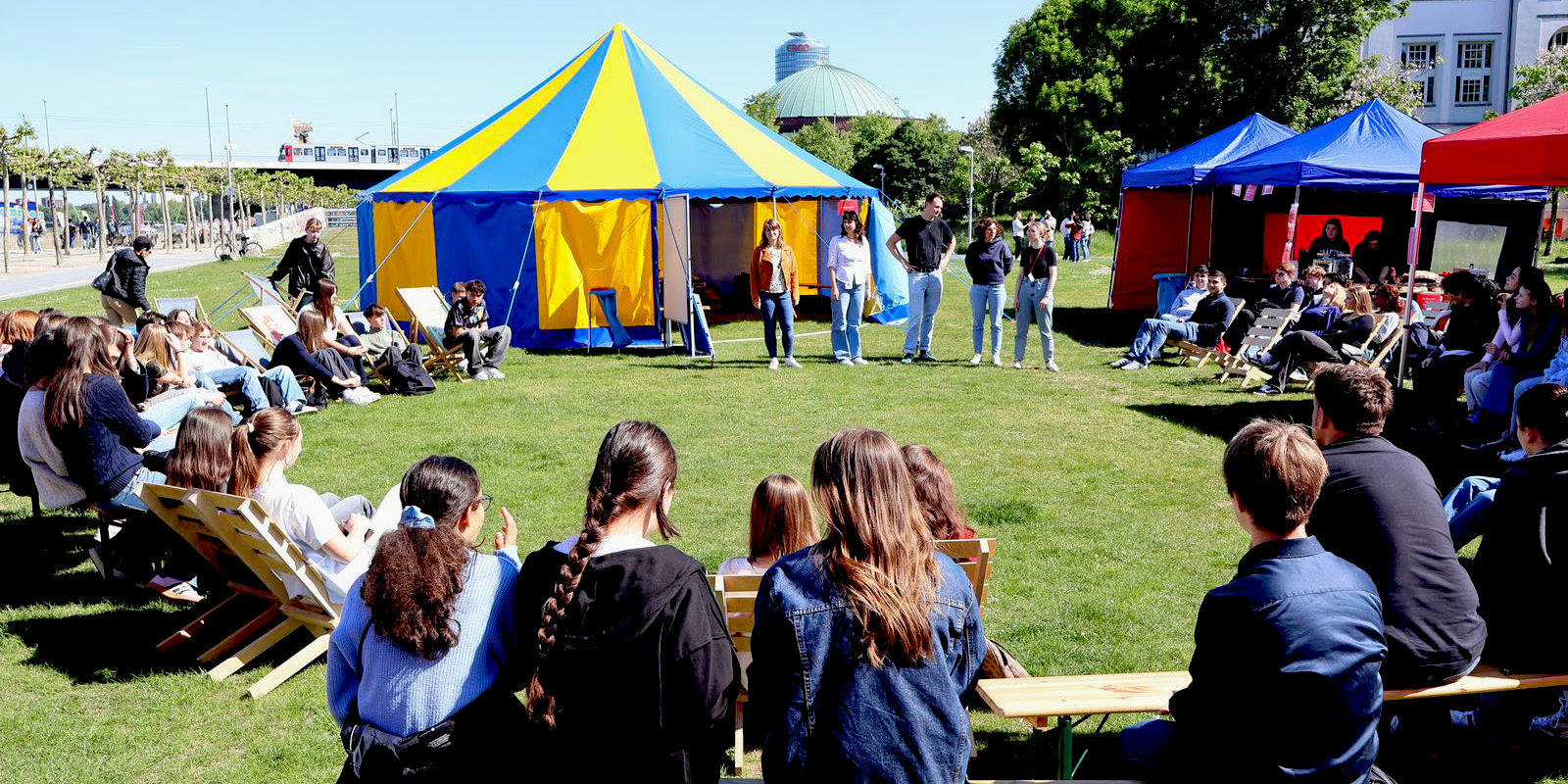 Geschichte und Kultur unter freiem Himmel und direkt am Rhein! Dafür schlug am 09. und 10. Mai das Düsseldorfer Geschichtsfestival seine Zelte auf der Wiese an der Reuterkaserne auf! Unter dem Motto „Was war? Was ist? Was bleibt?“ erkundeten junge Düsseldorfer*innen gemeinsam die Geschichte des Nationalsozialismus, das Kriegsende und die Befreiung vor 80 Jahren.