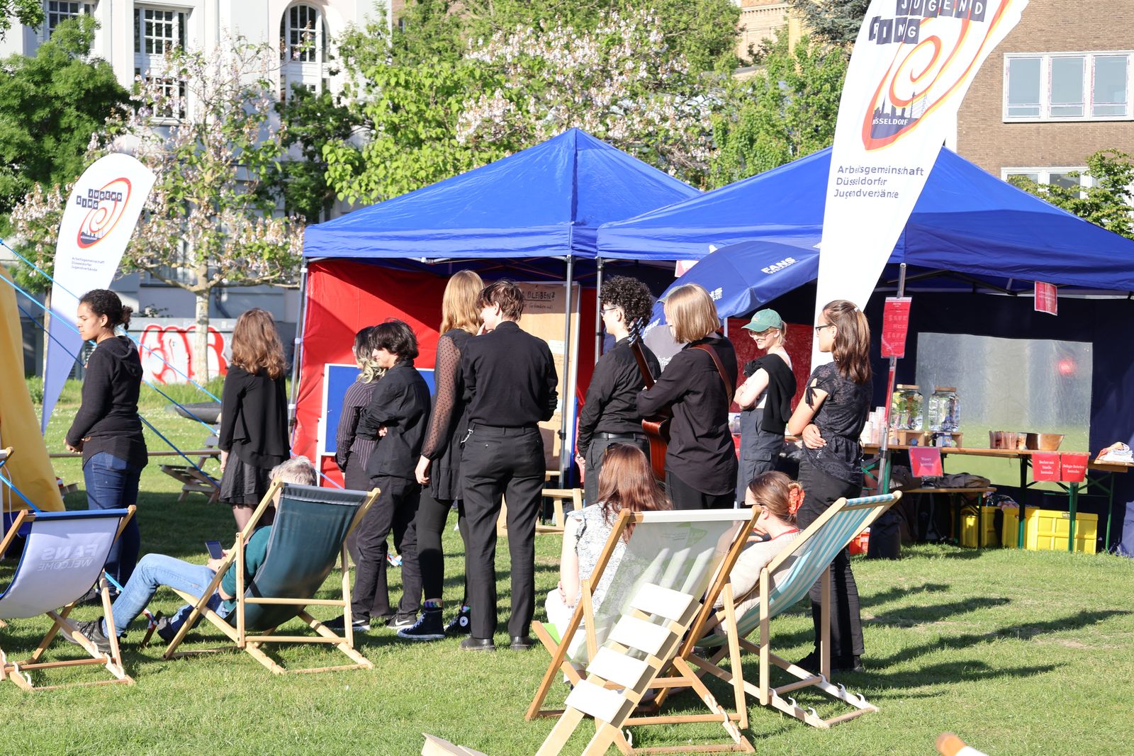 Am Samstag stellten sich die Organisator*innen des Festivals – Jugendring Düsseldorf, Mahn- und Gedenkstätte, Erinnerungsort Alter Schlachthof und ZAKK – mit Ständen den Besucher*innen und Passant*innen vor. Ebenfalls präsentierten sich das Haus Spilles sowie Start with a Friend; außerdem zeigten Schüler*innen des Friedrich-Rückert-Gymnasiums ihre Projektarbeit.
