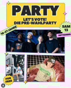Ob im Kinosaal, auf der Straße oder bei unserer Wahlparty – wir feiern Demokratie nicht als Konzept, sondern als etwas, das wir gemeinsam leben. Am 13. September feiern wir den Abschluss der Reihe mit unserer Pre-Wahlparty „BeLoud – Let’s vote!“. Noch einmal treffen, Musik hören, vegan essen, junge politische Initiativen kennenlernen und mit klarer Haltung in den Wahlsonntag starten.